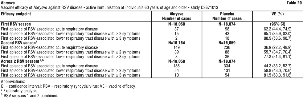 Individuals 60 years of age and older by active immunisation. Study C3671013 was a Phase 3, multicentre, randomised, double-blind, placebo-controlled study to assess the efficacy, immunogenicity and safety of Abrysvo in the prevention of RSV-associated lower respiratory tract disease in individuals 60 years of age and older during the first RSV season and the long-term efficacy and immunogenicity of Abrysvo across two RSV seasons. The need for revaccination with a subsequent dose of Abrysvo has not been established.