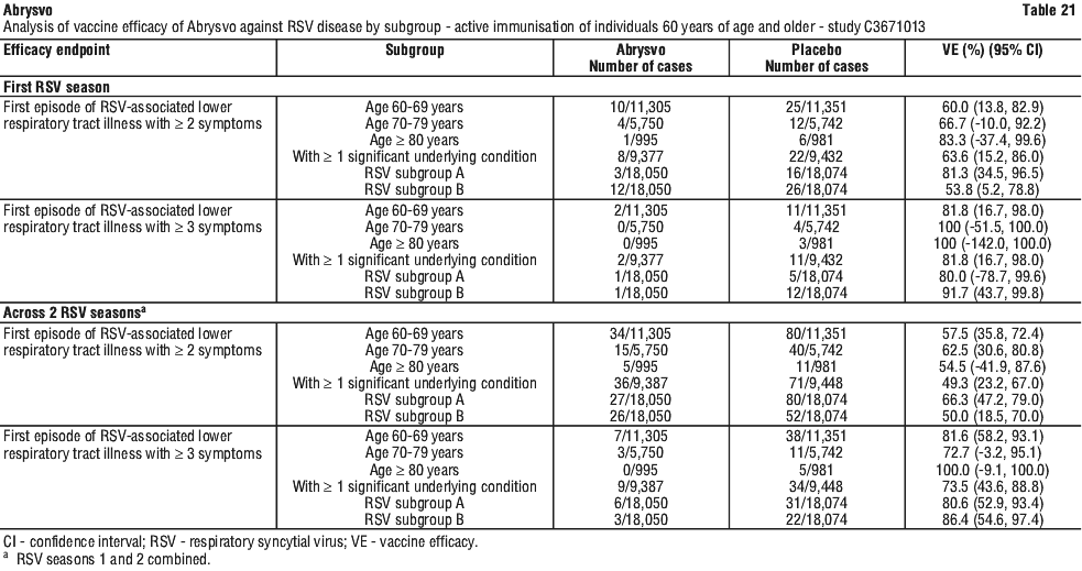 Subgroup analyses by age and prespecified high risk groups in Abrysvo recipients were consistent with the main analyses and support consistent VE observed across different age and risk groups. GMFRs of NTs for RSV A, RSV B and combined RSV A/B were 11.4, 12.6 and 12.0, respectively, in the 60-69 years age group, 12.1, 12.8 and 12.4 in the 70-79 years age group and 11.2, 15.2 and 13.0 in the ≥ 80 years age group. GMFRs of NTs for RSV A, RSV B and combined RSV A/B were 12.3, 13.8 and 13.0, respectively, in recipients with > 1 significant underlying condition.