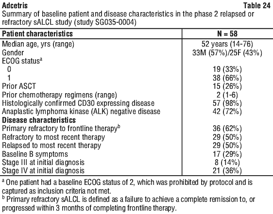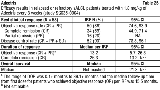 The median time from initial sALCL diagnosis to first dose with Adcetris was 16.8 months. Ten (10) patients (17%) received 16 cycles of Adcetris; the median number of cycles received was 7 (range, 1 to 16).