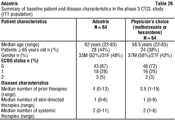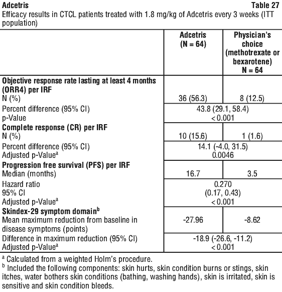 The primary endpoint was objective response rate that lasts at least 4 months (ORR4) (duration from first response to last response ≥ 4 months), as determined by an independent review of the Global Response Score (GRS) consisting of skin evaluations (modified severity weighted assessment tool [mSWAT] assessment), nodal and visceral radiographic assessment, and detection of circulating Sezary cells. The ORR4 was significantly higher in the Adcetris arm compared to the physician's choice arm (56.3% vs 12.5%, p < 0.001). Table 27 includes the results for ORR4 and other key secondary endpoints.