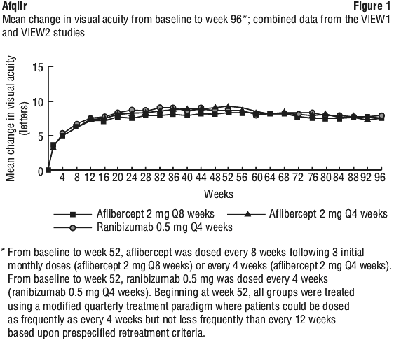 The overall mean age in the PPS was 76 years (range 53 to 94), and 59% of subjects were 75 years or older. 56% of subjects were female and 89% were white. At baseline, the overall median time since diagnosis of nAMD in the PPS was 12 days, and less than 30 days had passed since diagnosis in 74% of patients. The overall mean BCVA score at baseline, as measured using ETDRS charts, was 59.7 letters. At baseline, 81% and 75% of subjects in the PPS had the occult lesion type in the Afqlir arm and the Eylea arm, respectively.