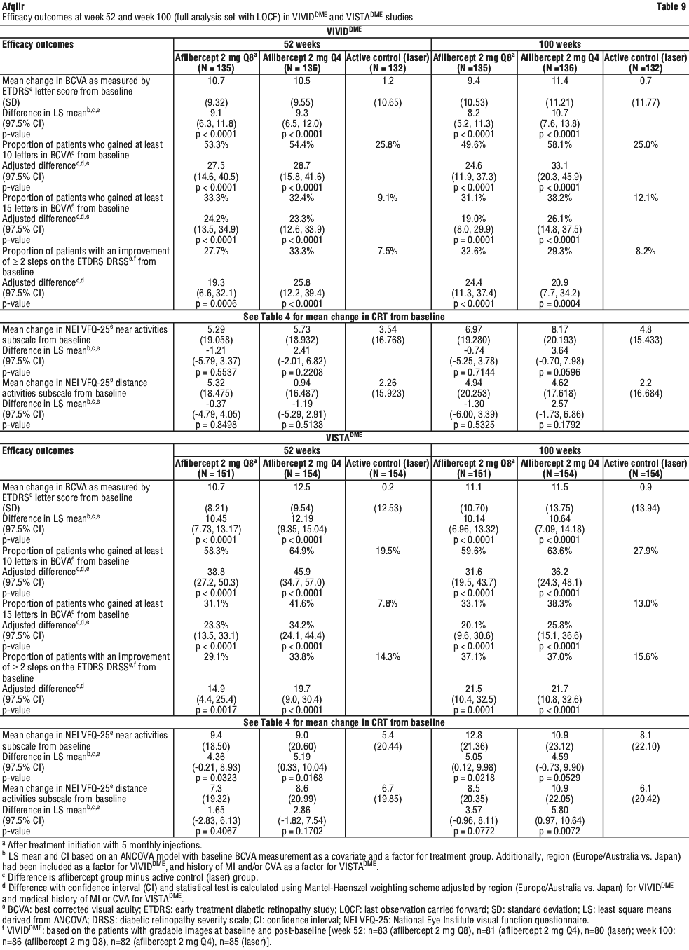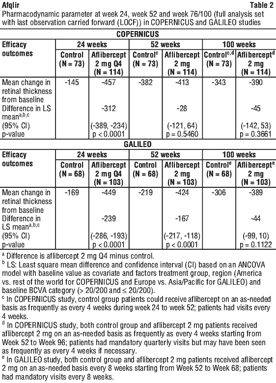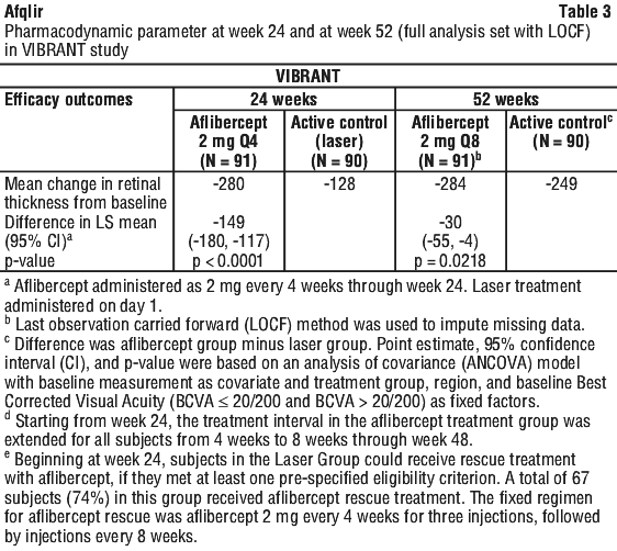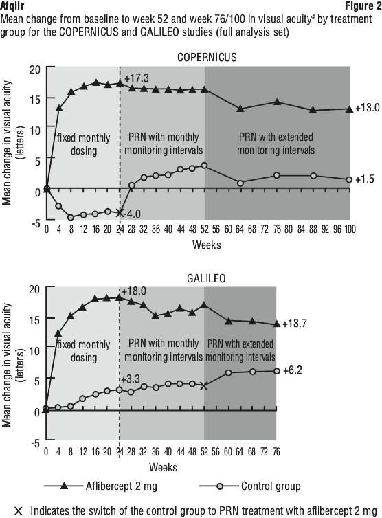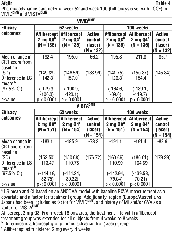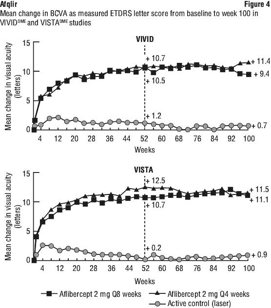 In both studies, the primary efficacy endpoint was the mean change from baseline in BCVA at Week 52 as measured by ETDRS letter score. Both aflibercept 2Q8 and aflibercept 2Q4 groups were shown to have efficacy that was statistically significantly superior to the laser control group. This benefit was maintained through week 100.