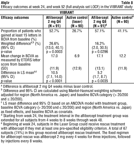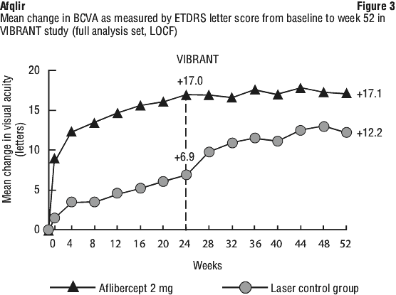 In the VIBRANT study, the primary efficacy endpoint was the proportion of patients who gained at least 15 letters in BCVA at Week 24 compared to baseline. At Week 24, the aflibercept group was superior to laser control for the primary endpoint.
