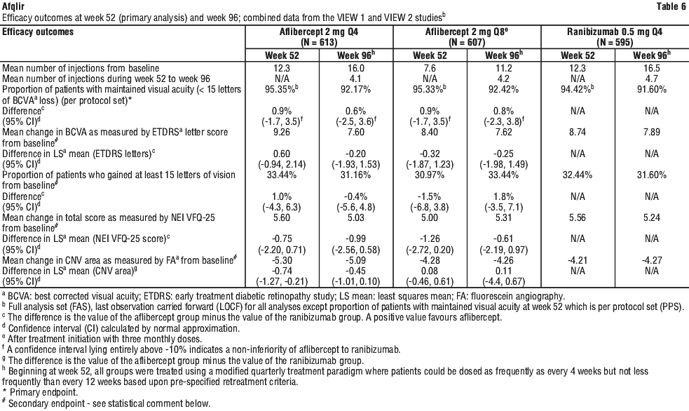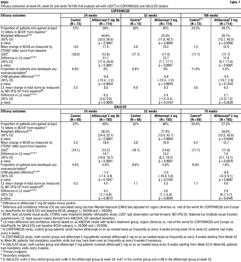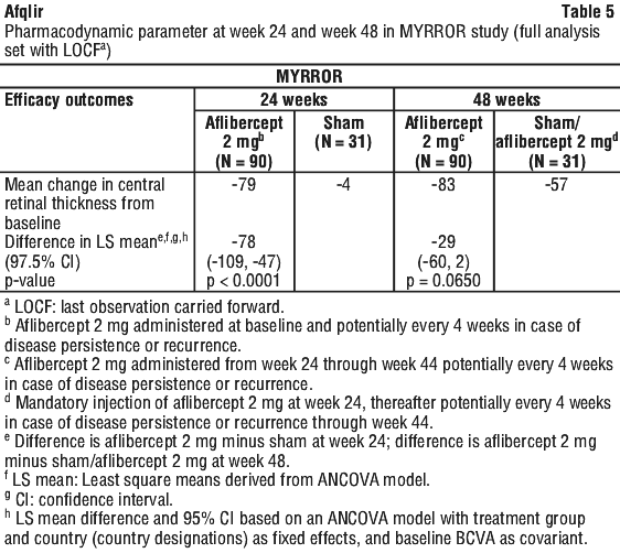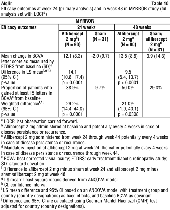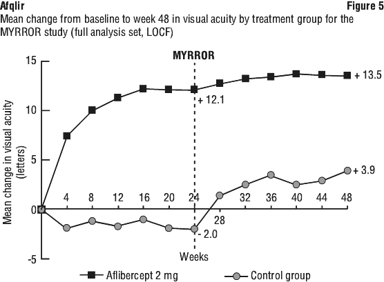 The difference between treatment groups was statistically significant in favour of aflibercept for the primary and confirmatory secondary efficacy endpoints at week 24. Differences for both endpoints were maintained through week 48.