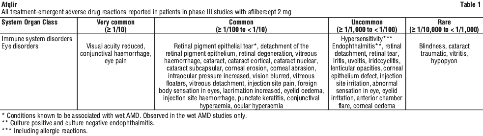 Afqlir (aflibercept) 2 mg is a biosimilar medicine to Eylea (aflibercept) 2 mg. The comparability of Afqlir (aflibercept) with Eylea (aflibercept) has been demonstrated with regard to physicochemical characteristics and efficacy and safety outcomes (see Section 5.1 Pharmacodynamic Properties, Clinical trials; Section 4.8 Adverse Effects (Undesirable Effects)). The evidence for comparability supports the use of Afqlir for the listed indications.