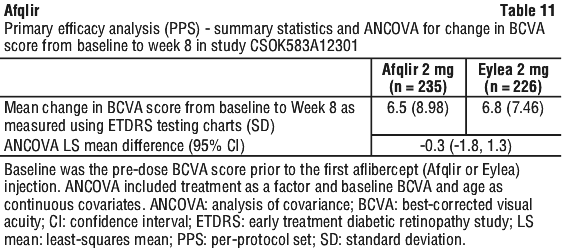 Primary efficacy was assessed at Week 8 after subjects have received two injections of either Afqlir 2 mg or Eylea 2 mg. At Week 8 the difference between Afqlir and Eylea in the LS mean changes in BCVA score from baseline was -0.3 letters for the PPS. The 95% CI (-1.8, 1.3) was contained within the prespecified interval [-3.5, +3.5]. Similar efficacy in terms of change in BCVA score from baseline was concluded. See Table 11.