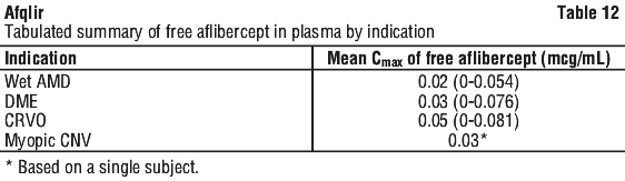 These pharmacokinetic results were consistent in pharmacokinetic sub-studies in patients with CRVO, BRVO, DME or myopic CNV, with mean Cmax of free aflibercept in plasma in the range of 0.03 to 0.05 microgram/mL and individual values not exceeding 0.14 microgram/mL. Thereafter, plasma concentrations of free aflibercept declined to values below or close to the lower limit of quantitation generally within one week; undetectable concentrations were reached before the next administration after 4 weeks in all patients. See Table 12.