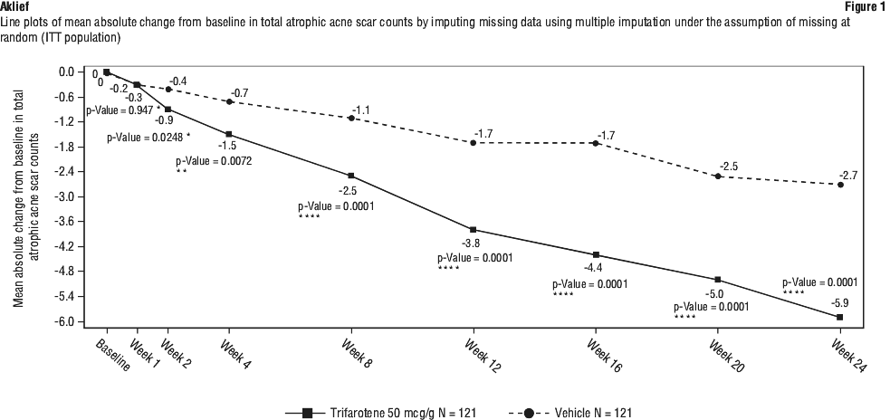 The absolute change in atrophic acne scar counts from Baseline to Week 24 showed a greater reduction of scar counts in the trifarotene cream treated area compared to the vehicle cream treated area (-5.9 vs. -2.7 scar counts), with a statistically significant bilateral difference of -3.2 (p-Value < 0.0001). Furthermore, descriptive statistics showed that trifarotene performed numerically better in 2-4 mm compared to > 4 mm atrophic scars. See Figure 1.