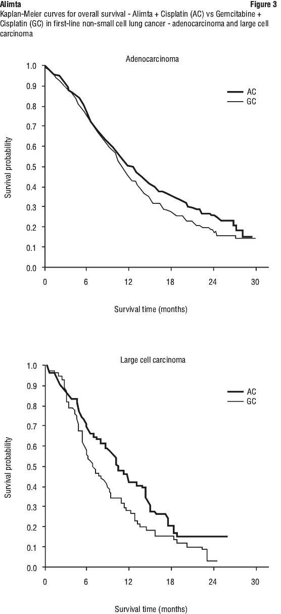 A multicentre, randomised, double blind, placebo controlled phase 3 study (PARAMOUNT), compared the efficacy and safety of continuation maintenance treatment with Alimta plus BSC (n = 359) with that of placebo plus BSC (n = 180) in patients with locally advanced (stage IIIB) or metastatic (stage IV) NSCLC other than predominantly squamous cell histology who did not progress after 4 cycles of first line doublet therapy of Alimta in combination with cisplatin. Of the 939 patients treated with Alimta plus cisplatin induction, 539 patients were randomised to maintenance treatment with Alimta or placebo. Of the randomised patients, 44.9% had a complete/ partial response and 51.9% had a response of stable disease to Alimta plus cisplatin induction. Patients randomised to treatment were required to have an ECOG performance status 0 or 1. The median time from the start of Alimta plus cisplatin induction therapy to the start of maintenance treatment was 2.96 months on both the Alimta arm and the placebo arm. Randomised patients received maintenance treatment until disease progression. For statistical purposes, efficacy and safety were measured from the time of randomisation after completion of first line (induction) therapy. Patients received a median of 4 cycles of maintenance treatment with Alimta and 4 cycles of placebo. A total of 169 patients (47.1%) completed ≥ 6 cycles maintenance treatment with Alimta, representing at least 10 total cycles of Alimta.