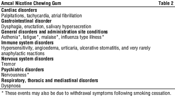 Nicotine from chewing gum may sometimes cause a slight irritation of the mouth and throat and increase salivation at the start of treatment. Excessive swallowing of dissolved nicotine may, at first, cause hiccupping. Those people with a tendency to indigestion may suffer initially from minor indigestion or heartburn. Slower chewing will usually overcome this problem. Excessive consumption of chewing gum by people who have not been in the habit of inhaling tobacco smoke could possibly lead to nausea, faintness or headaches. Less common side effects include palpitations, redness and rashes.