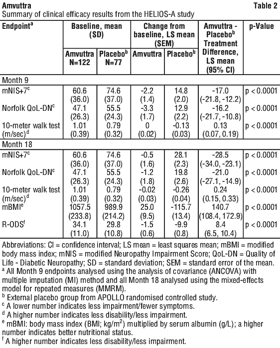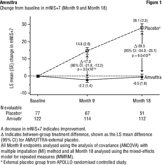 Treatment with Amvuttra in the HELIOS-A study demonstrated statistically significant improvements in all endpoints (see Table 2 and Figure 1) measured from baseline to Month 9 and 18, compared to the external placebo group of the APOLLO study (all p < 0.0001).