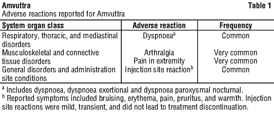 During the 18-month treatment period of the global, randomised, open-label clinical study (HELIOS-A) in adult patients with hATTR amyloidosis with polyneuropathy, the most frequently occurring adverse reactions reported in Amvuttra-treated patients were pain in extremity (15%) and arthralgia (11%).