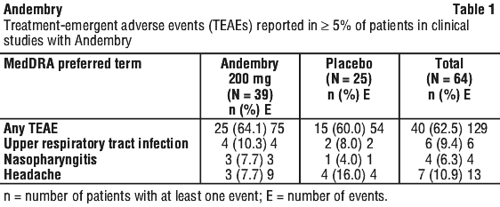 Table 1 and Table 2 summarise treatment-emergent adverse events and adverse reactions observed in the VANGUARD pivotal study conducted with Andembry on 39 HAE patients in a phase 3, multicentre, randomised, double-blind, placebo-controlled parallel group study, where 75 adverse events were reported in 25/39 (64.1%) patients. Of these 75 events, 9 were reported as related to Andembry in 4/39 (10.3%) patients.
