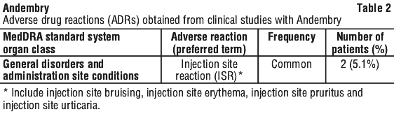 In the VANGUARD pivotal study, 3 incidents of ISR of mild severity were observed in 2 patients who received Andembry. Temporal relationship (began within 1-3 days after investigational product administration and resolved within 1-3 days with no change in dosage) was identified for all 3 ISRs, all of which were assessed as related to Andembry.