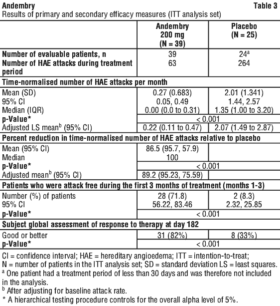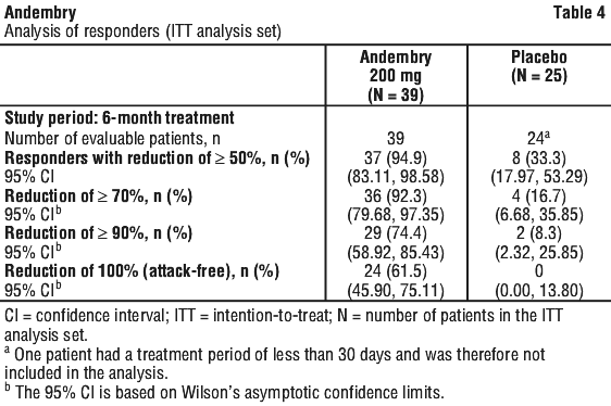 Andembry demonstrated clinically meaningful and statistically significant efficacy when compared with placebo across all primary and secondary endpoints in the Intent-to-Treat (ITT) population as seen in (Table 3).