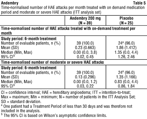 The time-normalised number of HAE attacks per month treated with on-demand medication and the number of moderate or severe HAE attacks were reduced with Andembry treatment compared with placebo (Table 5).