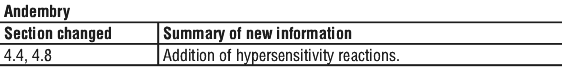 Cases of hypersensitivity have been observed during postmarketing use of Andembry (see Section 4.4 Special Warnings and Precautions for Use). Because postmarketing reporting of adverse reactions is voluntary and from a population of uncertain size, it is not always possible to reliably estimate the frequency of these reactions or establish a causal relationship to product exposure.