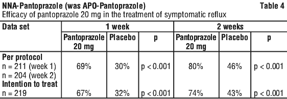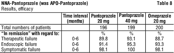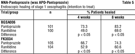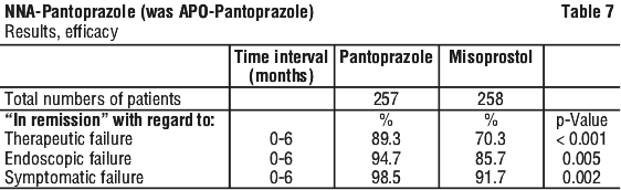 Pantoprazole 20 mg once daily was statistically significantly superior to misoprostol 200 microgram twice daily with regard to 'therapeutic failure' and to 'endoscopic failure'. Reflux oesophagitis was included as an efficacy endpoint in the study which may have biased the results in favour of pantoprazole. A causal association between NSAIDs and reflux oesophagitis has not been established. In addition, proton pump inhibitors such as pantoprazole have documented beneficial treatment effects on reflux oesophagitis while misoprostol (a prostaglandin E1 analogue) has negligible therapeutic effects.