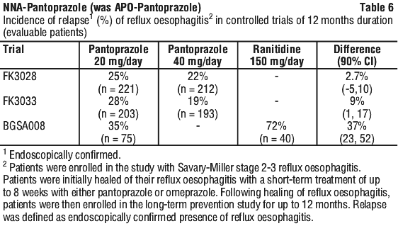 Pantoprazole 20 and 40 mg/day doses were therapeutically equivalent based on the predefined equivalence criterion of the 90% confidence interval of the difference between doses being within ± 20%. Four uncontrolled trials with varying periods of follow-up support the long-term efficacy of pantoprazole 40-80 mg/day in the maintenance of healed reflux oesophagitis in patients previously treated for moderate to severe reflux oesophagitis. Two of the trials included patients with gastric and duodenal ulcer. The incidence of relapse at one year was 12-15%, at two years was 22-25% and at six years was 40%.