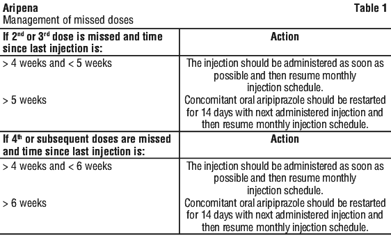 For patients who have never taken oral or injectable aripiprazole, establish tolerability with oral aripiprazole prior to initiating treatment with Aripena. When switching patients from previous long-acting injectable antipsychotics, initiate Aripena therapy in place of the next scheduled injection, with 14 days of concurrent oral aripiprazole. Aripena should then be continued monthly.