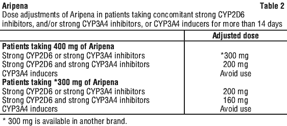 Dosage adjustments are recommended in patients taking concomitant strong CYP3A4 inhibitors or strong CYP2D6 inhibitors for more than 14 days. If the CYP3A4 inhibitor or CYP2D6 inhibitor is withdrawn, the Aripena dose may need to be increased. See Table 2. Avoid concomitant use of CYP3A4 inducers with Aripena for more than 14 days, because the blood levels of aripiprazole will be decreased and may fall below the effective levels. See Table 2.