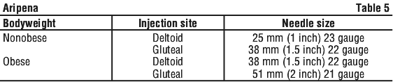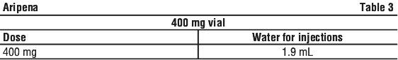 Therapeutic kit. Aripena is available in a therapeutic kit which contains one vial of lyophilised powder, one vial of diluent (water for injections), one 3 mL sterile syringe with a 21 gauge needle for reconstitution, one sterile syringe without a needle, one 1-inch (25 mm) 23 gauge sterile safety needle for injection, one 1.5-inch (38 mm) 22 gauge sterile safety needle for injection, one 2-inch (51 mm) 21 gauge sterile safety needle for injection and one vial adapter.