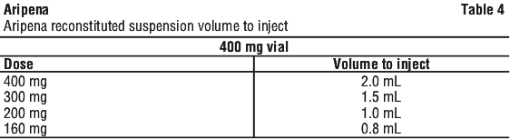 The suspension should be injected immediately after reconstitution, but can be stored below 25°C for up to 4 hours in the vial. If the injection is not performed immediately after reconstitution, shake the vial vigorously for at least 60 seconds to re-suspend prior to the injection. Aripena should be administered by a healthcare professional only, once-monthly. The injection should be injected slowly as a single injection (doses must not be divided) into the deltoid or gluteal muscle.