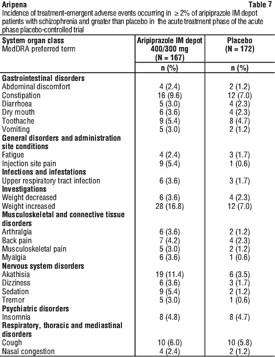 In this study patients were administered aripiprazole IM depot (n=167) or IM placebo (n=172) on days 0, 28, and 56. The dose could be adjusted down and up within the range of 400 mg to 300 mg on a one-time basis. Patients who had not taken aripiprazole previously had tolerability with oral aripiprazole (10 mg daily for 3 days) established prior to initiating treatment with aripiprazole IM depot or placebo. Patients randomised to aripiprazole IM depot also received concomitant oral aripiprazole, 10 to 20 mg/day, for the first two weeks of the study.