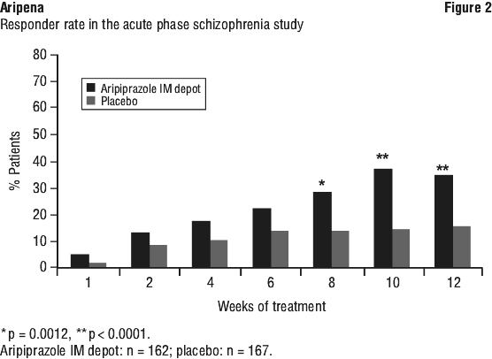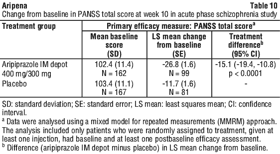 The efficacy of aripiprazole IM depot in adult patients in the acute phase of schizophrenia was established in one short-term (12 weeks), randomised, double-blind, placebo-controlled trial. Patients included in this trial met DSM-IV-TR criteria for schizophrenia and must have experienced an acute psychotic episode as defined by both a PANSS total score ≥ 80 and a PANSS score > 4 on each of four specific psychotic symptoms (conceptual disorganisation, hallucinatory behaviour, suspiciousness/persecution, unusual thought content) at baseline. Patients experiencing their first psychotic episode and those considered treatment resistant were excluded. Patients had a mean PANSS total score of 103 (range 82 to 144) and a CGI-S score of 5.2 (markedly to severely ill) at entry.