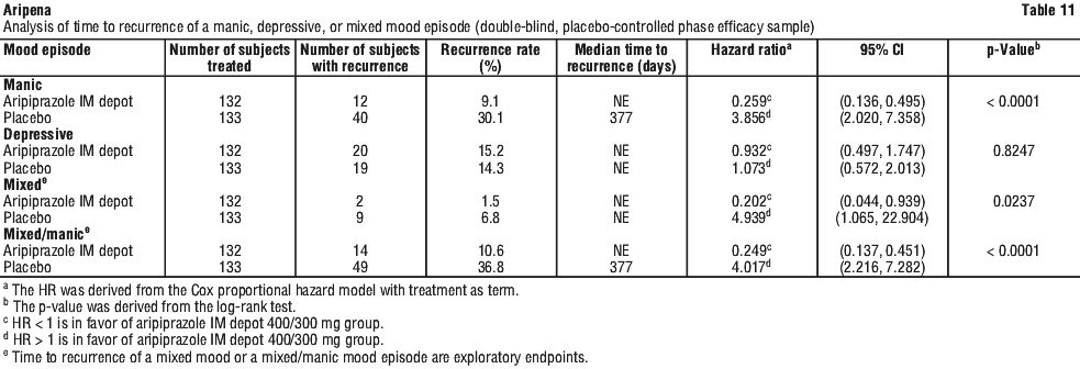 For the key secondary endpoint, the percentage of patients meeting the criteria for recurrence of any mood episode (manic, mixed, depressive) was significantly lower (Fisher's exact test p < 0.0001) in the aripiprazole group (26.5%) compared with placebo (51.1%). The times to recurrence of manic, mixed, and mixed/manic mood episodes were statistically significantly delayed in the aripiprazole IM depot group compared with the placebo group, with the log-rank test p-values of < 0.0001, 0.0237, and < 0.0001, respectively. The time to recurrence of a depressive mood episode showed no difference between the aripiprazole IM depot and placebo groups (p = 0.8247) (see Table 11).