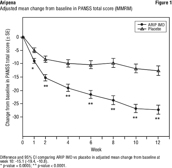 Further, the superiority of aripiprazole IM depot compared to placebo is supported by the results of the analysis of PANSS total score, PANSS positive and negative subscales, CGIS, CGI-I. During the double blind phase, significant differences in mean PANSS total and CGI-S scores were observed.
