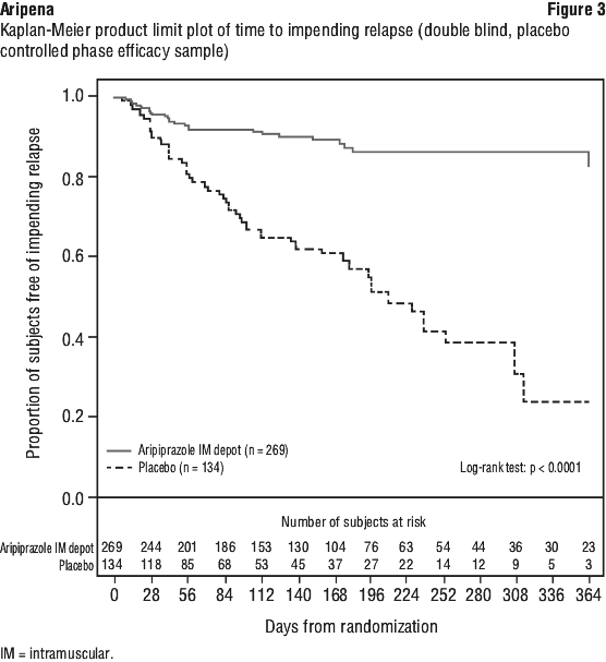 The final efficacy analysis included 403 randomised patients and 80 exacerbations of psychotic symptoms/impending relapse events. The trial was terminated early because efficacy was demonstrated by the pre-specified interim analysis. The hazard ratio from the Cox proportional hazard model for the placebo to aripiprazole IM depot comparison was 5.029 (95% CI: 3.154, 8.018), thus patients in the placebo group had a 5-fold greater risk of experiencing impending relapse than patients in the aripiprazole IM depot group. The trial results support the efficacy for aripiprazole IM depot over 52 weeks of treatment.