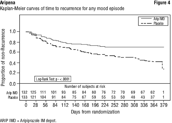 The final efficacy analysis included 265 patients and the primary efficacy endpoint is shown in the Kaplan-Meier curves of the cumulative proportion of patients with recurrence of any mood episode (manic, mixed or depressive) during the 52-week, double-blind treatment phase for aripiprazole IM depot and placebo treatment groups (see Figure 4). A total of 103 patients with recurrence of any mood episode were observed during the double-blind treatment phase: 35 occurred during aripiprazole treatment and 68 occurred during placebo treatment. The hazard ratio from the Cox proportional hazard model for the placebo to aripiprazole comparison was 2.220 (95% CI: 1.475, 3.340), thus patients receiving placebo had a 2.2-fold greater risk of experiencing a recurrence of a mood episode than patients receiving aripiprazole IM depot. These results support efficacy for aripiprazole IM depot over 52 weeks of treatment.