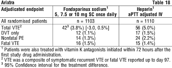 Major bleeding, all at surgical sites, was observed in 8 patients (2.4%) treated with Arixtra 2.5 mg compared to 2 (0.6%) with placebo (p = 0.063). Permanent premature treatment cessation was observed in 2 of these patients in the Arixtra group and in 1 patient in the placebo group. In each group, two of these major bleeding episodes (0.6%) led to surgical re-intervention. Death occurred in 5 randomised patients (1.5%) treated with Arixtra 2.5 mg compared to 7 (2.1%) with placebo. The 2 excess deaths with placebo were due to PE.