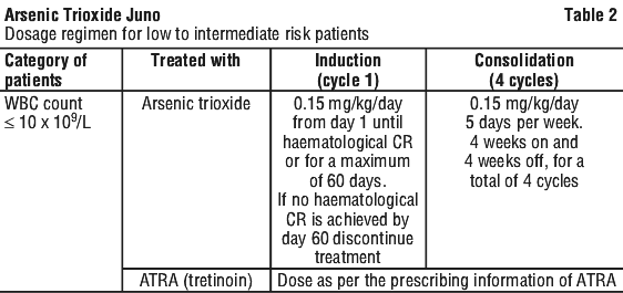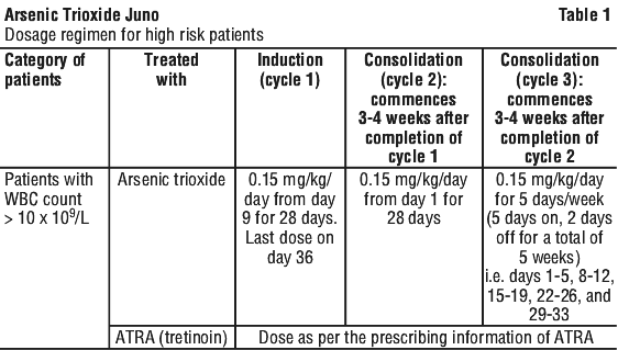 Arsenic trioxide may be given in combination with all-trans-retinoic acid (ATRA) and/or chemotherapy. Dosage regimens for high risk patients and low to intermediate risk patients are described in Table 1 and Table 2 respectively.