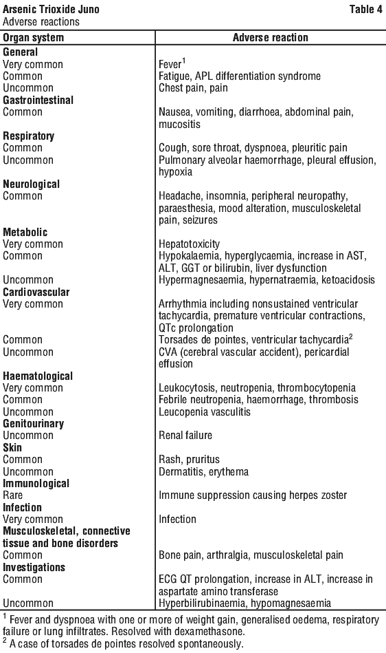 Sudden death, sometimes early in the treatment with arsenic trioxide has occurred. Autopsies have sometimes failed to identify a cause of sudden death. Cerebral haemorrhage has been the cause of death in three patients. Another patient on whom an autopsy was not performed became asystolic and died while on continuous cardiac telemetry. The level of arsenic trioxide excreted in the urine does not seem to be related as a cause of death. Adverse reactions are ranked below using the following convention: very common (≥ 1/10); common (≥ 1/100 to < 1/10); uncommon (≥ 1/1,000 to < 1/100) and rare (≥ 1/10,000 to < 1/1,000). See Table 4.