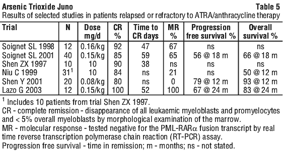 Arsenic trioxide has been investigated in 40 relapsed or refractory APL patients, previously treated with an anthracycline and a retinoid regimen, in an open-label, single-arm, non-comparative study (Soignet SL, 2001). Patients received arsenic trioxide 0.15 mg/kg/day intravenously over 1 to 2 hours daily until the bone marrow was cleared of leukaemic cells or up to a maximum of 60 days. In this study in relapsed or refractory APL patients, treatment with arsenic trioxide was associated with the development of hyperleukocytosis (≥ 10 x 109/L) in some patients. There did not appear to be a relationship between baseline white blood cell (WBC) counts and development of hyperleukocytosis nor did there appear to be a correlation between baseline WBC count and peak WBC counts.