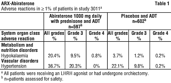 ARX-Abiraterone should be used with caution in patients with a history of cardiovascular disease. The safety of abiraterone acetate in patients with left ventricular ejection fraction (LVEF) < 50% or New York Heart Association (NYHA) Class III or IV heart failure (in study 301) or NYHA Class II to IV heart failure (in studies 3011 and 302) was not established. Before treatment with ARX-Abiraterone, hypertension must be controlled, and hypokalaemia must be corrected.