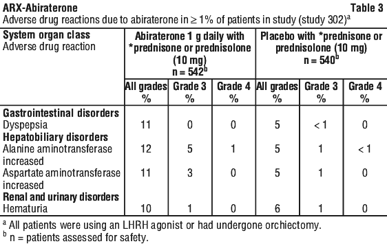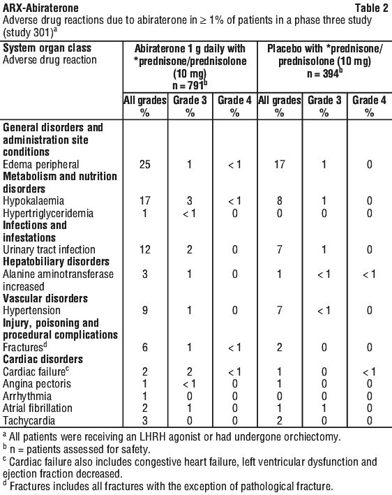 In an analysis of adverse reactions of composite Phase 3 studies with abiraterone, adverse reactions that were observed in ≥ 10% of patients were peripheral oedema, hypokalaemia, hypertension, urinary tract infection, and alanine aminotransferase increased, and/or aspartate aminotransferase increased.