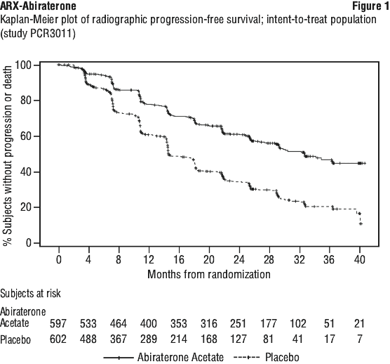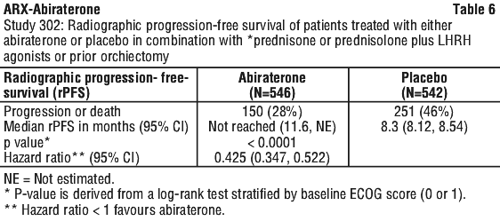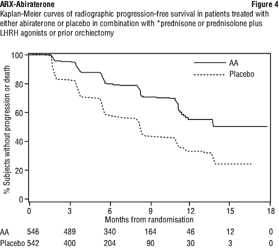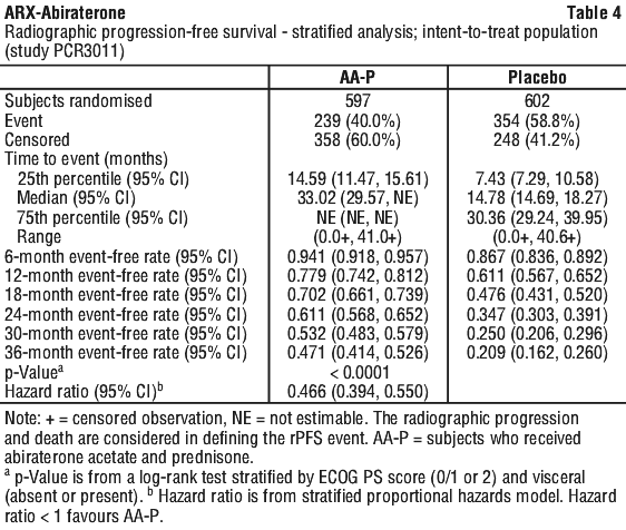At the planned rPFS analysis there were 401 radiographic progression events; 150 (28%) of patients treated with abiraterone and 251 (46%) of patients treated with placebo had radiographic evidence of progression or had died. A significant difference in rPFS between treatment groups was observed (see Table 6 and Figure 4).
