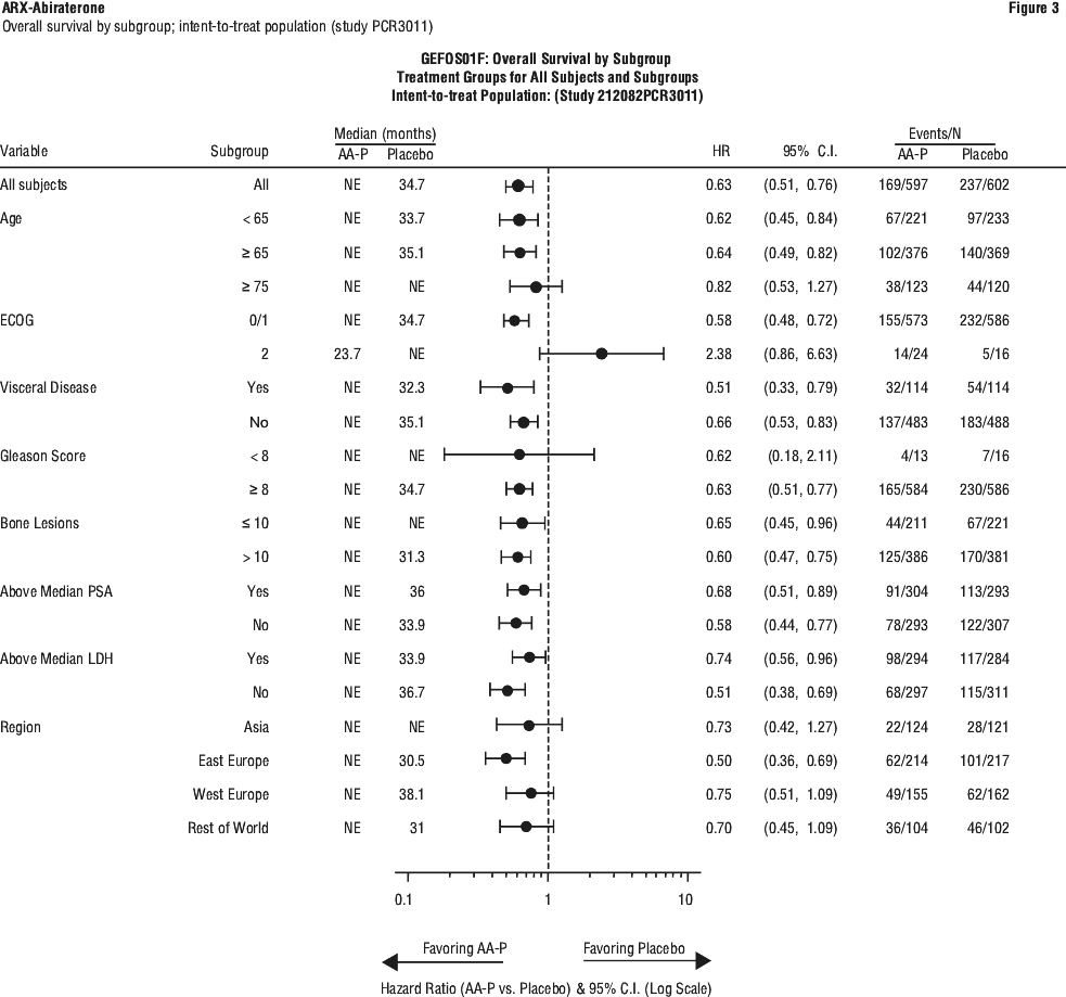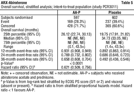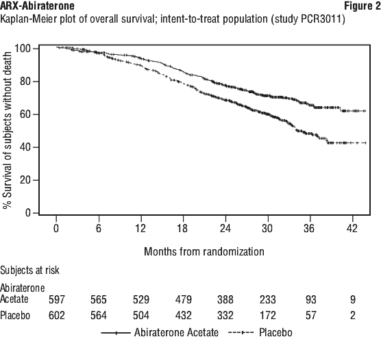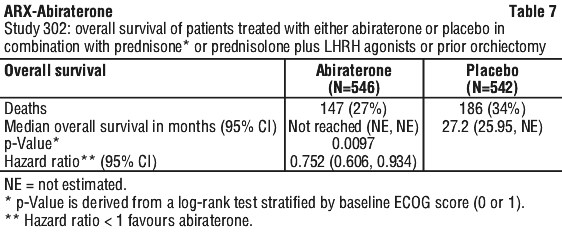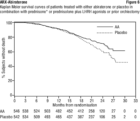A planned interim analysis for overall survival was conducted after 333 deaths were observed. The study was unblinded, following the recommendation of the Independent Data Monitoring Committee (IDMC), based on the magnitude of clinical benefit observed. Twenty seven percent (147 of 546) of patients treated with abiraterone, compared with 34% (186 of 542) of patients treated with placebo, had died. Overall survival was longer for abiraterone than placebo with a 25% reduction in risk of death (Hazard Ratio = 0.752; 95% CI: 0.606 - 0.934). The p value was 0.0097 which did not meet the pre-specified level (0.0008) to claim statistical significance (see Table 7 and Figure 6).