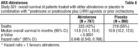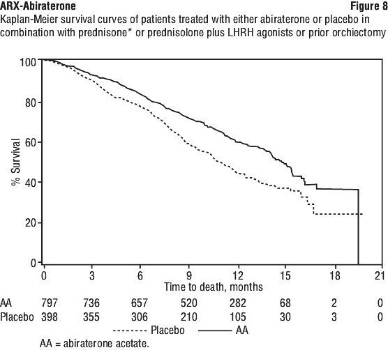 In a planned analysis conducted after 552 deaths were observed, 42% (333 of 797) of patients treated with abiraterone compared with 55% (219 of 398) of patients treated with placebo had died. A statistically significant improvement in median overall survival was seen in patients treated with abiraterone (see Table 8).