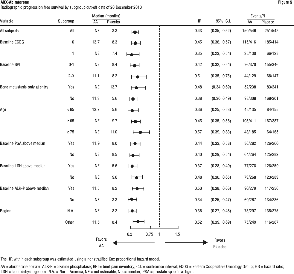 Subgroup analyses of rPFS are presented in Figure 5. The treatment effect of abiraterone on the coprimary endpoint of the independent review of rPFS was consistently favourable and highly robust across all subgroups.