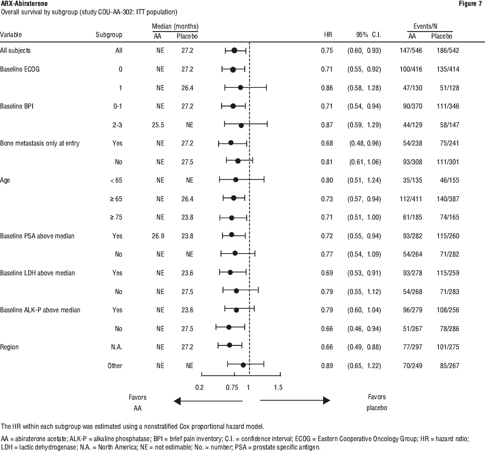 Subgroup analyses of overall survival are presented in Figure 7. The treatment effect of abiraterone on overall survival was favorable across all subgroups (all HR < 1.0).