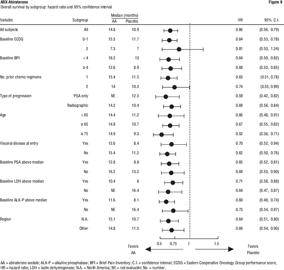 Subgroup survival analyses showed a consistent survival benefit for treatment with abiraterone (see Figure 9).