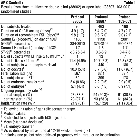 In a multicenter, double blind, randomised, dose finding study (protocol 38602), ganirelix acetate doses ranging from 62.5 microgram to 2,000 microgram and recombinant FSH were administered to 332 patients undergoing COH for IVF. The results of the selected dose (250 microgram) are summarized in Table 1.