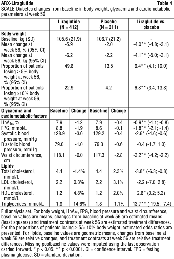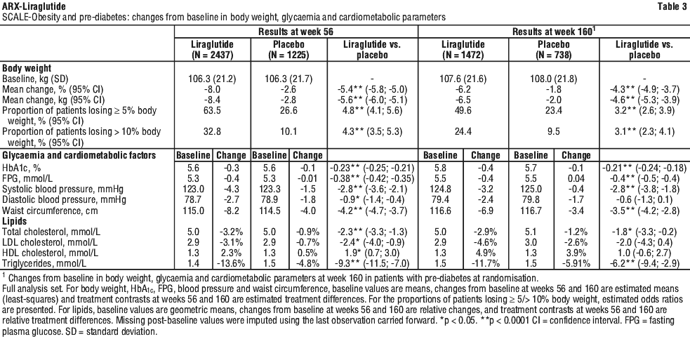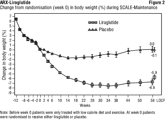 In the 56-week part of SCALE-Obesity and Pre-diabetes, fewer patients treated with liraglutide had developed type 2 diabetes compared to patients treated with placebo (0.2% vs. 1.1%). More patients with pre-diabetes at baseline had reversed their pre-diabetes compared to patients treated with placebo (69.2% vs. 32.7%). In the 160 week part of SCALE-Obesity and Pre-diabetes, the primary efficacy endpoint was the proportion of patients with onset of type 2 diabetes evaluated as time to onset. At week 160, while on treatment, 3% treated with liraglutide and 11% treated with placebo were diagnosed with type 2 diabetes. More patients in the liraglutide 3.0 mg group (65.9%) than the placebo group (36.3%) had regressed their pre-diabetes to normoglycaemia by week 160 (odds ratio 3.6 [95% CI: 3.0 to 4.4], p < 0.001).