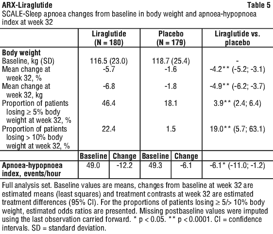 Treatment with liraglutide significantly reduced the severity of obstructive sleep apnoea as assessed by change from baseline in the AHI compared with placebo (Table 5).