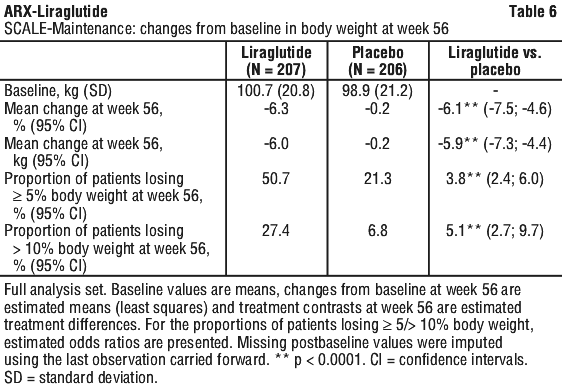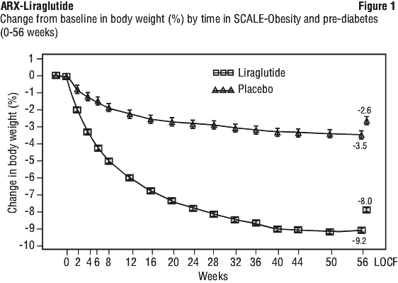 In SCALE-Obesity and Pre-diabetes, patients treated with liraglutide achieved a greater weight loss, as compared to placebo. The weight loss occurred mainly in the first year. The mean percent change in body weight and the proportions of patients achieving greater than or equal to 5% and greater than 10% weight loss from baseline to week 160 were also significant compared to placebo in this trial (Table 3).