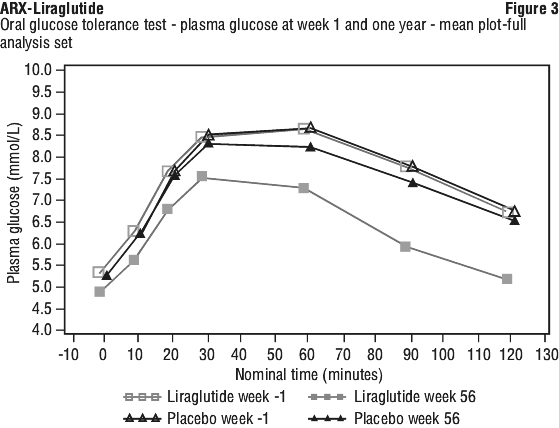 Compared to baseline levels, the week 160 post-challenge plasma glucose AUC was reduced with liraglutide, while on treatment, but remained unchanged with placebo. Additionally, post-challenge insulin AUC remained relatively stable with liraglutide during the 160-week treatment period, while declining in the placebo group. The estimated treatment effects were all statistically significant in favour of liraglutide. See Figure 3.